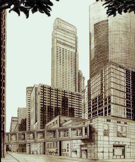 Cityscape / Streets of Minneapoils, MN / Pencil, Chalk On Paper